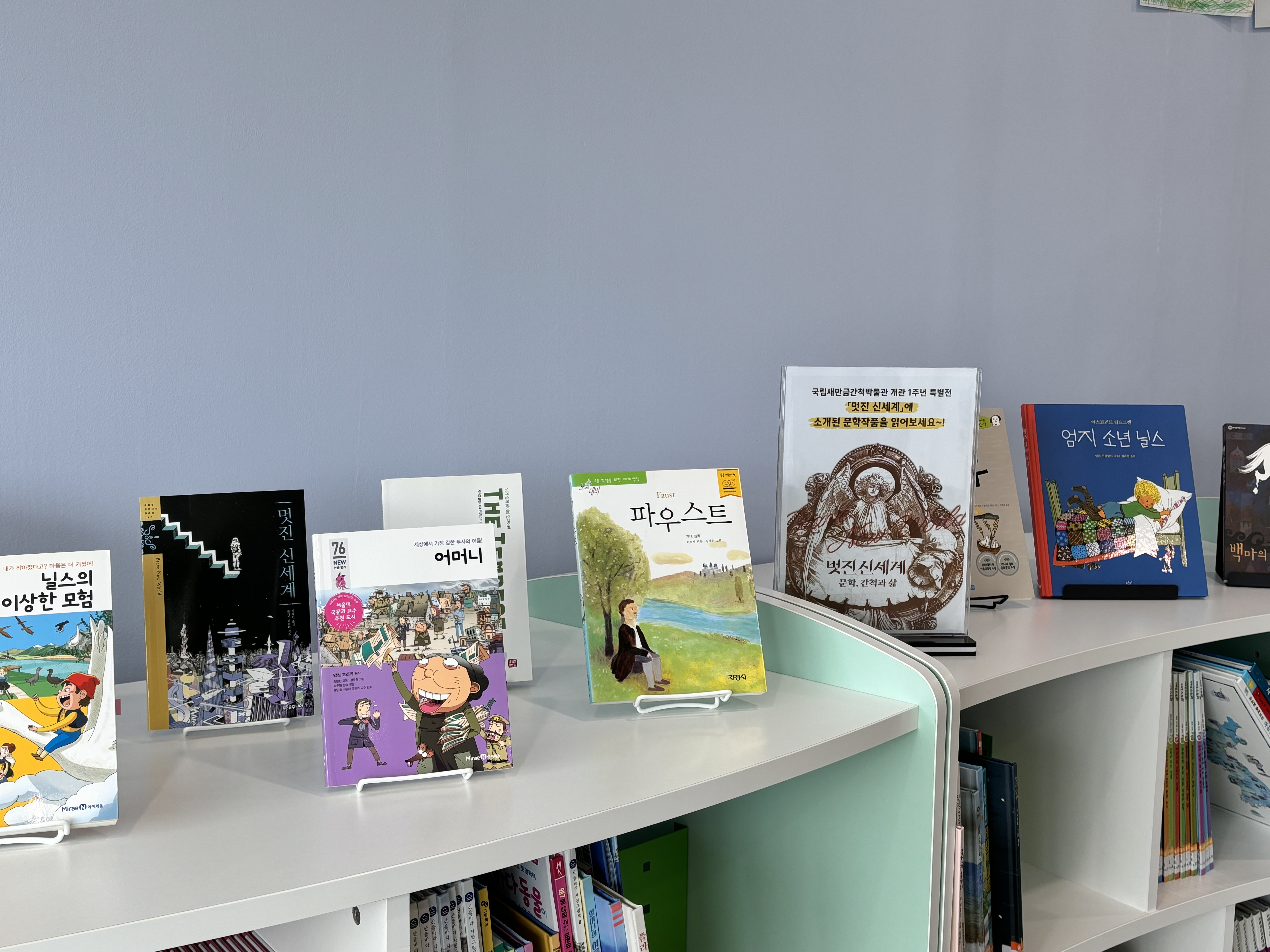 전시된 여러 간척 문학 작품 가운데 어린이와 청소년을 위해 쉽게 펴낸 도서들을 교육 ·관리동 1층의 [어린이간척연구실]에서 만나볼 수 있어요.