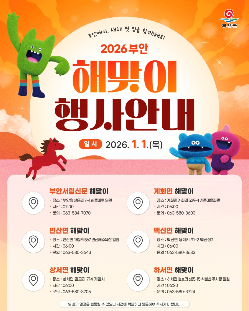 ※ 자세한 사항은 위에 게시된 포스터 또는 부안군청 문화관광 누리집(https://www.buan.go.kr/tour/index.buan?menuCd=DOM_000000210001007000) 참조
