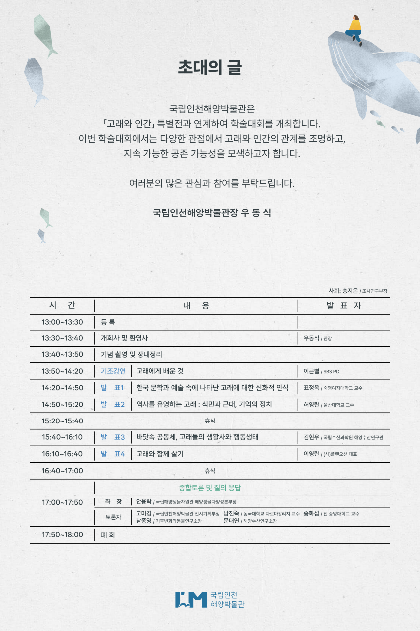 국립인천해양박물관에서는 특별전과 연계하여 「고래와 인간, 그리고 공생」을 주제로 학술대회를 개최합니다.