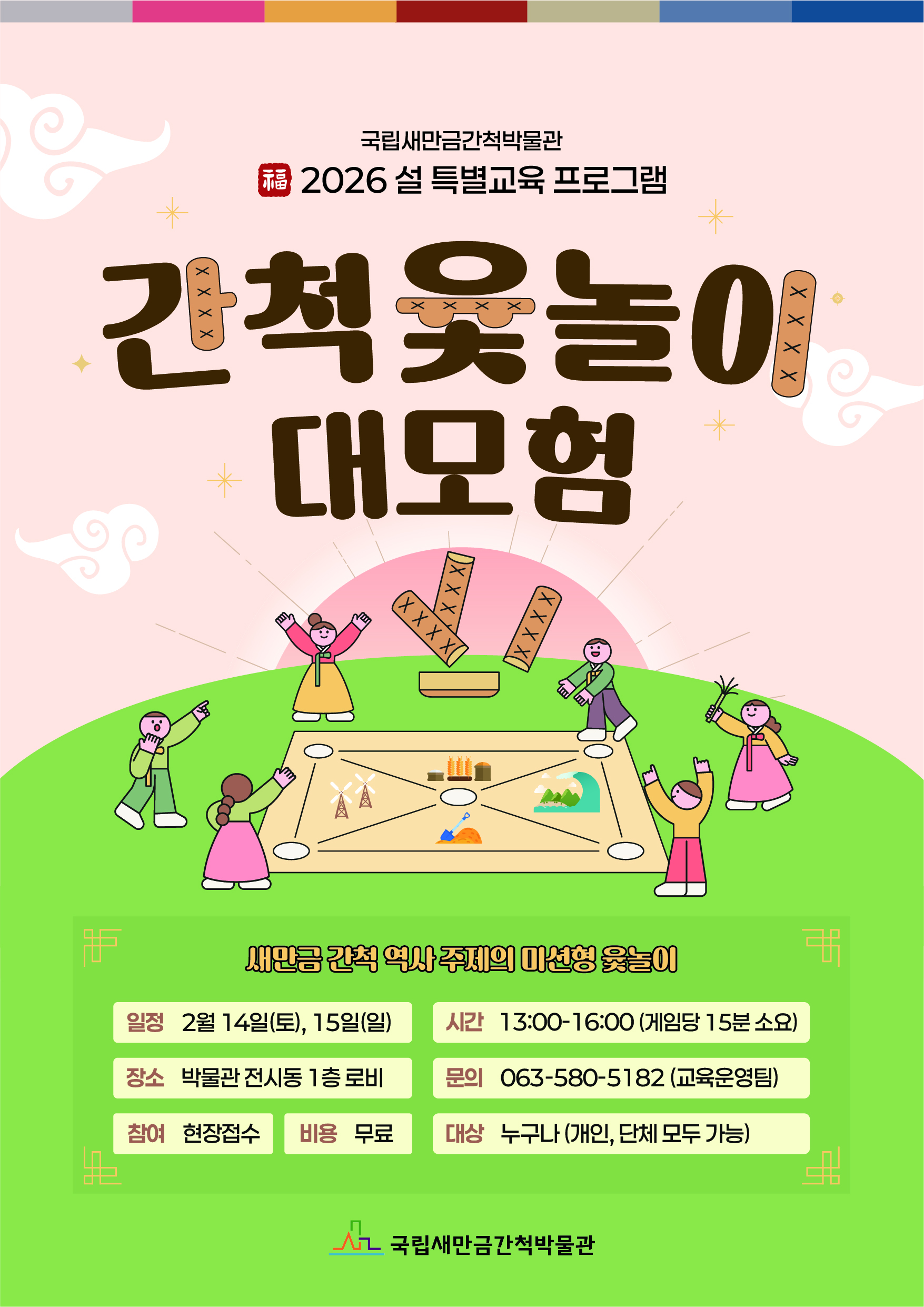 - [체험] 새만금 및 간척 역사 내용을 게임과 퀴즈로 구성한 윷놀이 판을 활용하여 강사 지도하에 진행하는 참여형 윷놀이 체험