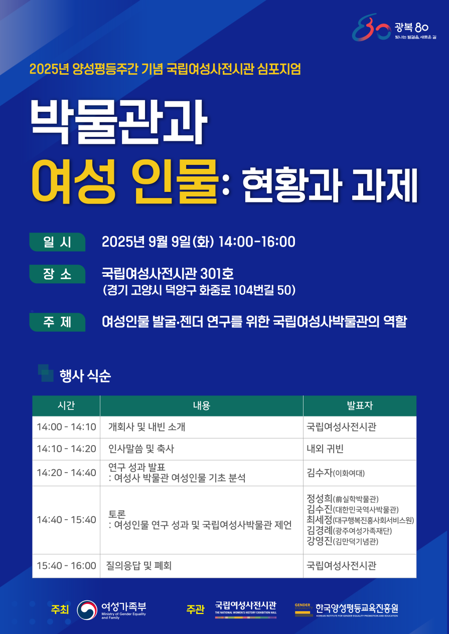 가. 행 사 명: 2025년 양성평등주간 기념 심포지엄 '박물관과 여성 인물: 현황과 과제'